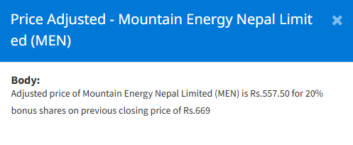 त्यसैगरी, माउन्टेन इनर्जीको २० प्रतिशत बोनस सेयरमा मूल्य समायोजन हुँदा भाउ ५५७.५० रुपैयाँ कायम भएको छ । मंगलबार यसको अन्तिम कारोबार मूल्य ६६९ रुपैयाँ थियो । कम्पनीहरुको समायोजित मूल्यलाई आधार मानेर बुधबार कारोबार खुला हुनेछ ।