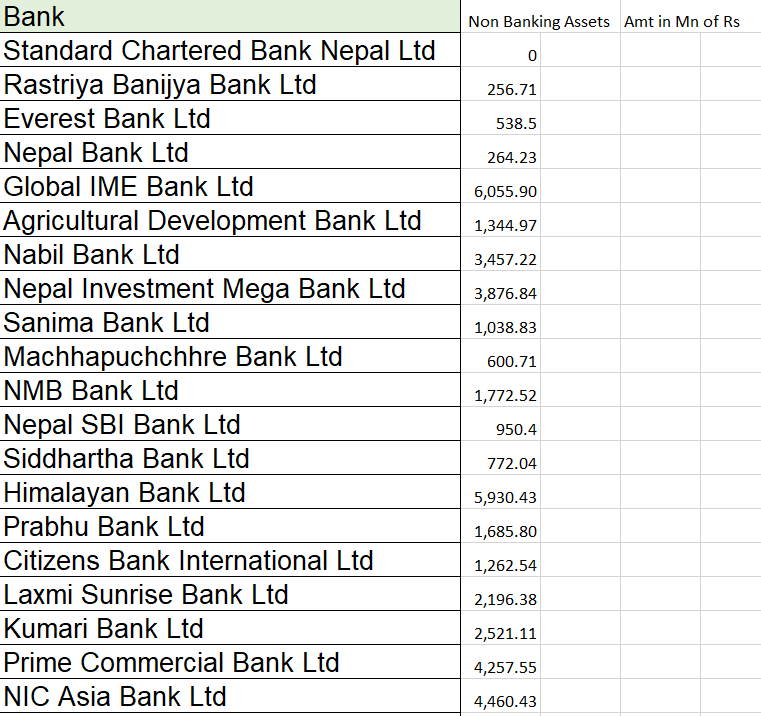 लक्ष्मी सनराइज बैंकको २ अर्ब १९ करोड ६० लाख रुपैयाँ पुगेको छ । एनएमबी बैंकको १ अर्ब ७७ करोड २० लाख पुगेको छ , प्रभु बैंकको १ अर्ब ६८ करोड ५० लाख पुगेको हो । कृषि विकास बैंकले १ अर्ब ३४ करोड ४० लाख , सिटिजन्स बैंकले १ अर्ब २६ करोड २० लाख, नेपाल एसबीआई बैंकले ९५ करोड , सिद्धार्थ बैंकले ७७ करोड २० लाख , माछापुच्छ्रे बैंकले ६० करोड , एभरेष्ट बैंकले ५३ करोड ३८ लाख नेपाल बैंकले २ करोड ६४ लाख रुपैयाँ गैरबैकिङ सम्पति रहेको छ ।