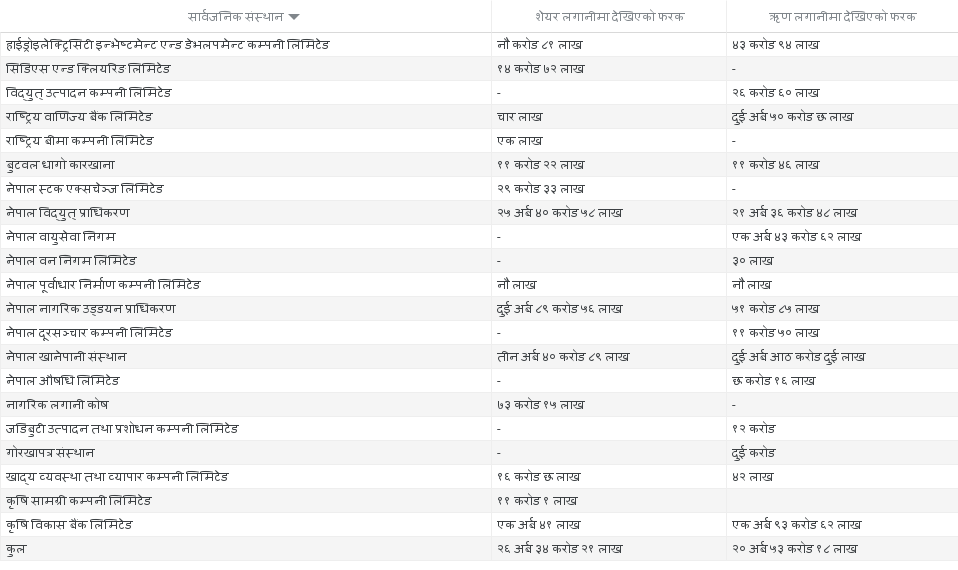 सार्वजनिक ऋण व्यवस्थापन कार्यालयका अनुसार विभिन्न संस्थानमा शेयरतर्फ रू २६ अर्ब ३४ करोड २१ लाख र ऋणतर्फ रू २० अर्ब ५३ करोड १८ लाख गरी कुल रू ४६ अर्ब ८७ करोड ३९ लाख सरकारी बराबर लगानीको हिसाब मिल्न सकेको छैन । सरकारले धेरै लगानी गरेको भन्छ, तर संस्थानहरुले कम भन्छन् ।