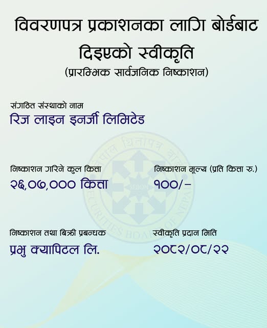 काठमाडौं । नेपाल धितोपत्र बोर्डले रिज लाइन इनर्जी लिमिटेडलाई आइपीओ बिक्री गर्न अनुमति दिएको छ । बोर्डले कम्पनीलाई १०० रुपैयाँ अंकित दरमा २६ लाख ७ हजार कित्ता सेयर बिक्री गर्न अनुमति दिएको हो । यसमा बिक्री प्रवन्धकको काम प्रभु क्यापिटलले गर्नेछ ।