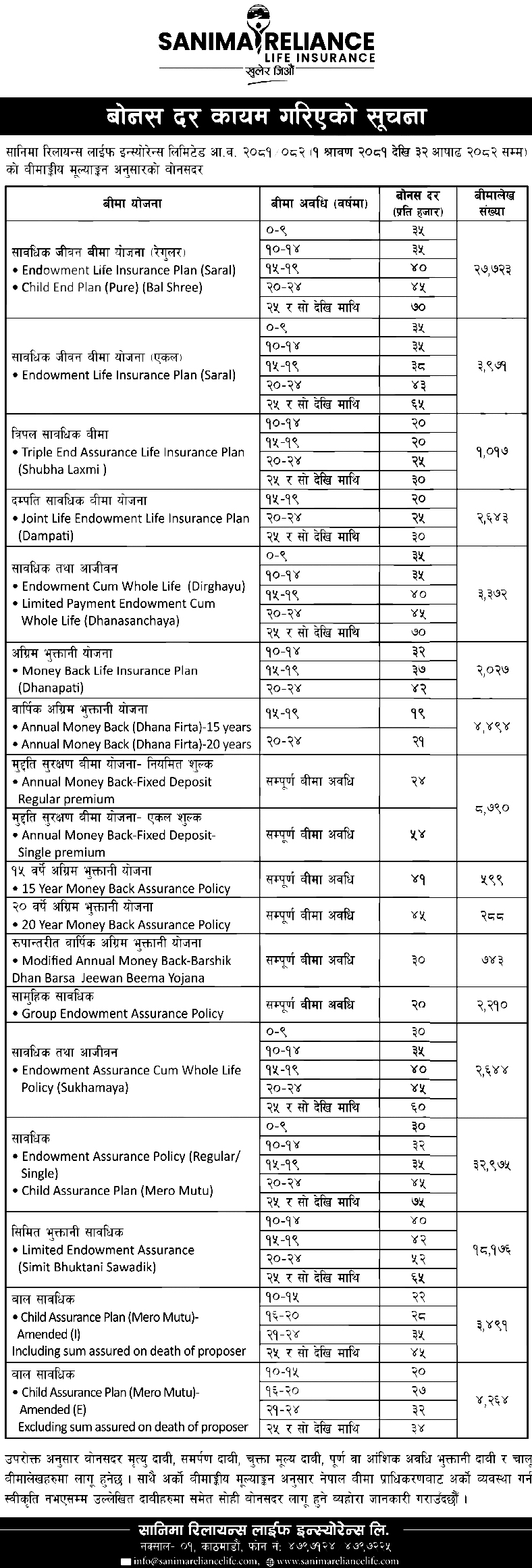 नयाँ बोनसदर अनुसार कम्पनीले सावधिक जीवन बीमा योजना (रेगुलर) मा बीमा अवधि अनुसार न्यूनतम ३५ रुपैयाँदेखि अधिकतम ७० रुपैयाँसम्म प्रति हजारका दरले बोनस दिने भएको छ। यता सावधिक जीवन बीमा योजना (एकल) मा न्यूनतम ३५ रुपैयाँदेखि अधिकतम ६५ रुपैयाँसम्म बोनसदर कायम गरेको छ । त्यसैगरी त्रिपल सावधिक बीमा योजनामा न्यूनतम २० रुपैयाँदेखि अधिकतम ३० रुपैयाँसम्म, दम्पत्ति सावधिक बीमा योजनामा न्यूनतम २० रुपैयाँदेखि अधिकतम ३० रुपैयाँसम्म र सावधिक तथा आजीवन बीमा योजनामा न्यूनतम ३५ रुपैयाँदेखि अधिकतम ७० रुपैयाँसम्म बोनस दिने भएको छ ।