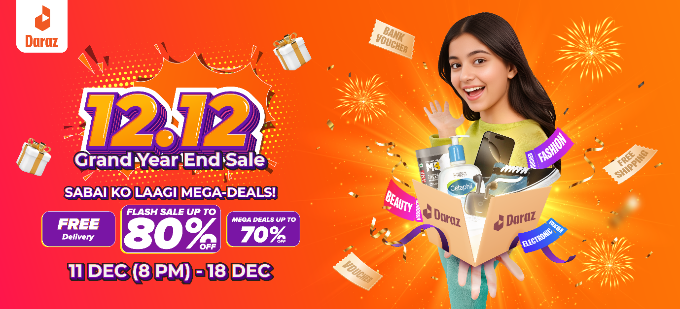 Kathmandu। Daraz Nepal, the country’s leading online shopping destination, is excited to launch the 12.12 Grand Year End Sale, offering shoppers an electrifying finale to the year’s biggest shopping season. The sale goes live at 8 PM on December 11 (Mangsir 25, 2082) and runs until December 18 (Poush 3, 2082), featuring flash sales up to 80% off, mega deals up to 70% off, and free delivery on select items.