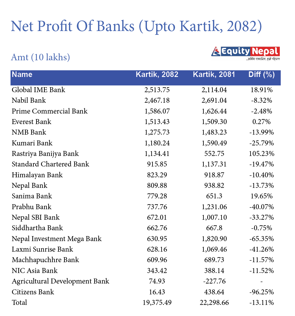 यता, नेपाल राष्ट्र बैंकले सार्वजनिक गरेको तथ्यांक अनुसार सबैभन्दा धेरै नाफा आर्जन गर्नेमा ग्लोबल आइएमई बैंक रहेको छ । यसले ४ महिनामा २ अर्ब ५१ करोड, नबिलले २ अर्ब ४६ करोड, प्राइम कमर्सियल बैंकले १ अर्ब ५८ करोड, एभरेष्टले १ अर्ब ५१ करोड, एनएमबिले १ अर्ब २७ करोड, कुमारी बैंकले १ अर्ब १८ करोड र राष्ट्रिय वाणिज्य बैंकले १ अर्ब १३ करोड नाफा कमाएको छ ।