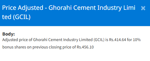 काठमाडौं । नेपाल स्टक एक्सचेन्ज (नेप्से)मा घोराही सिमेन्ट इन्डष्ट्रि लिमिटेडको १० प्रतिशत बोनस सेयरमा मूल्य समायोजन भएको छ । कम्पनीको बिहीबारको अन्तिम कारोबार मूल्य ४५६.१० रुपैयाँलाई आधार मानेर भाउ समायोजन गरिएको हो । समायोजन पश्चात यसको सेयर भाउ ४१४.६४ रुपैयाँ कायम भएको छ । सोही भाउलाई आधार मानेर घोराहीको कारोबार खुल्नेछ ।