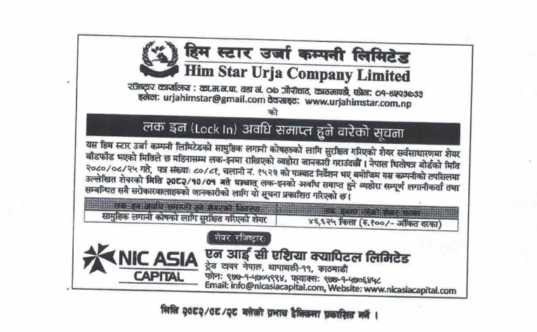 काठमाडौं । हिम स्टार उर्जा कम्पनीको म्युचुअल फन्डहरुलाई बाँडफाँड गरेको सेयरको लक इन अवधि माघ १० गत समाप्त हुने भएको छ ।यस कम्पनीले म्युचुअल फन्डहरुलाई बाँडफाँट गरेको ४६ हजार ६२५ कित्ता सेयरको लक इन अवधि आगामी माघमा समाप्त हुन लागेको हो । लक इन समाप्त भएपछि म्युचुअल फन्डहरुले होल्ड गरेको सेयर बिक्री गर्न सक्नेछन् ।