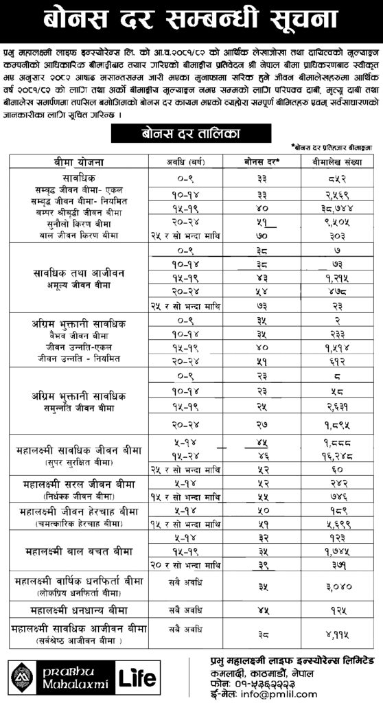 महालक्ष्मी बाल बचत बीमामा ३२ रुपैयाँदेखि ३९ रुपैयाँसम्म, महालक्ष्मी वार्षिक धनफिर्ता बीमा अन्तर्गतको लोकप्रिय धनफिर्ता बीमाका सबै बीमा अवधिमा समान ३५ रुपैयाँ, महालक्ष्मी धनधान्य बीमाका सबै अवधिमा पनि समान ४५ रुपैयाँ र महालक्ष्मी आवधिक आजीवन बीमा अन्तर्गतको सर्वश्रेष्ठ आजीवन बीमाका सबै बीमा अवधिमा पनि समान ३८ रुपैयाँ बोनस दिने भएको छ ।