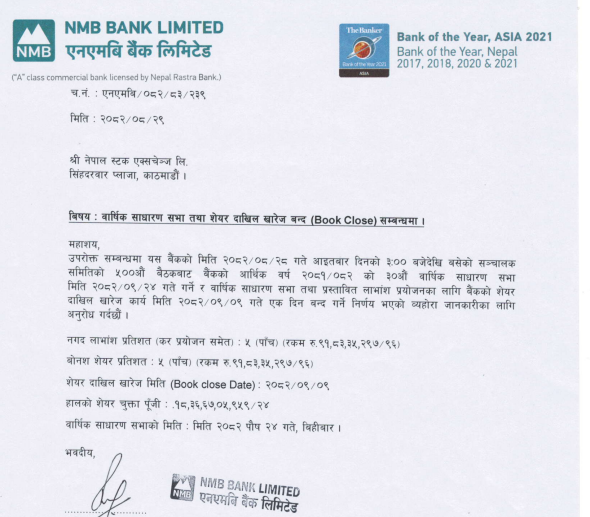 काठमाडौं । एनएमबि बैंक लिमिटेडले पुस २४ गते साधारण सभा बोलाएको छ । सभामा बैंकले गत वर्षको नाफाबाट सेयरधनीलाई ५ प्रतिशत नगद लाभंश (कर प्रयोजनसहित) र ५ प्रतिशत बोनस सेयर प्रस्ताव पेश गर्नेछ । साधरण सभा प्रयोजनाको लागि एनएमबि बैंकले पुस ९ गते बुक क्लोज गर्ने भएको छ । यस अनुसार पुस ८ गतेसम्म नेप्सेमा कारोबार भइ कायम सेयरधनीहरुले लाभांश हात पार्न र साधारण सभामा सहभागिता जनाउन सक्नेछन् ।