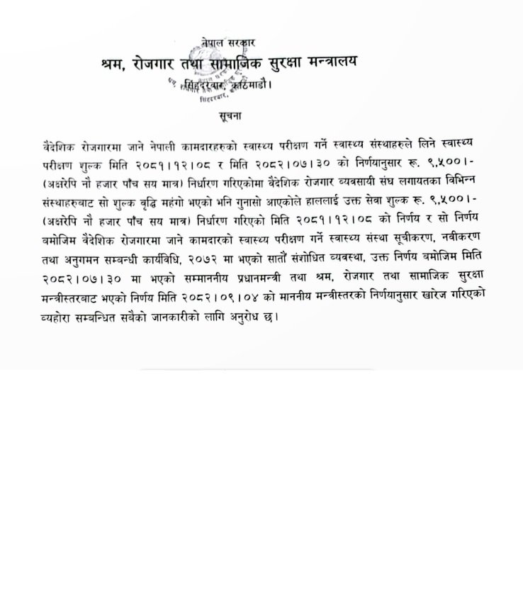 काठमाडौं । वैदेशिक रोजगारीमा जाने कामदारका लागि तोकिएको स्वास्थ्य परीक्षण शुल्क वृद्धि खारेज गरिएको छ। श्रम, रोजगार तथा सामाजिक सुरक्षा मन्त्री राजेन्द्रसिंह भण्डारीले मन्त्रीस्तरीय निर्णयमार्फत बढाइएको शुल्क फिर्ता गर्दै पुरानै दर कायम गरेका हुन्। यसअघि स्वास्थ्य परीक्षण शुल्क ६ हजार ५०० रुपैयाँबाट बढाएर ९ हजार ५०० रुपैयाँ पुर्याइएको थियो। तर, उक्त निर्णयले गरिब तथा विपन्न वर्गका श्रमिकमाथि अतिरिक्त आर्थिक भार परेको भन्दै चौतर्फी आलोचना भएपछि सरकारले शुल्क वृद्धि खारेज गरेको हो।