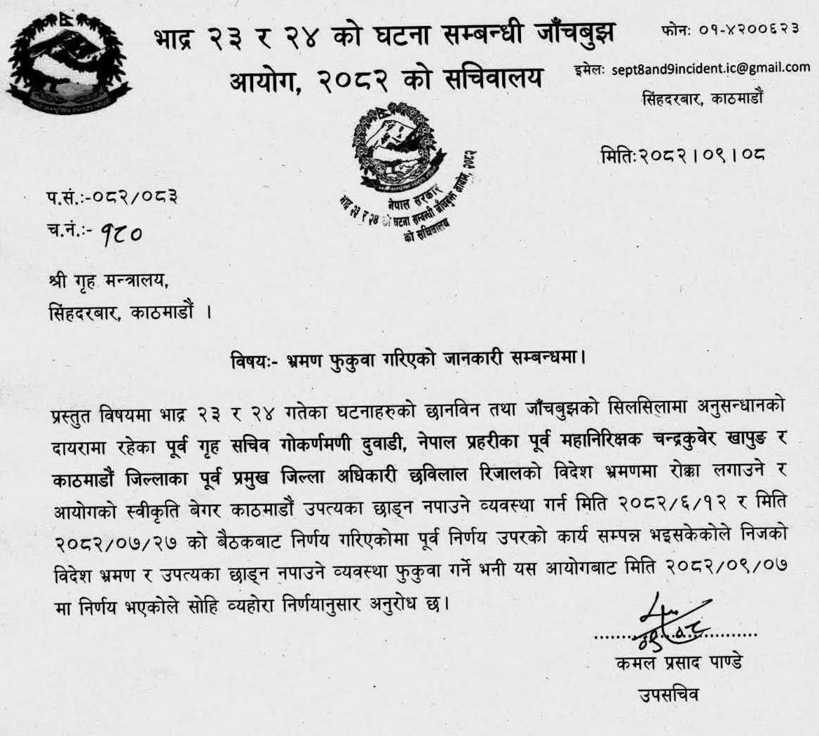 काठमाडौं । भदौ २३ र २४ गतेको घटना सम्बन्धी जाँचबुझ आयोगले ३ जनाको स्थानहद फुकुवा गरेको छ । मंगलबार एक पत्र पठाउँदै आयोगले तत्कालीन गृहसचिव गोकर्णमणि दुवाडी, आईजीपी चन्द्रकुवेर खापुङ र काठमाडौंका सीडीओ छविलाल रिजालको स्थानहद फुकुवा गरेको हो । उनीहरुले यसअघि विदेश भ्रमण र उपत्यका छाड्न नपाउने व्यवस्था गरिएको थियो । सोही व्यवस्था फुकुवा गरिएको हो ।