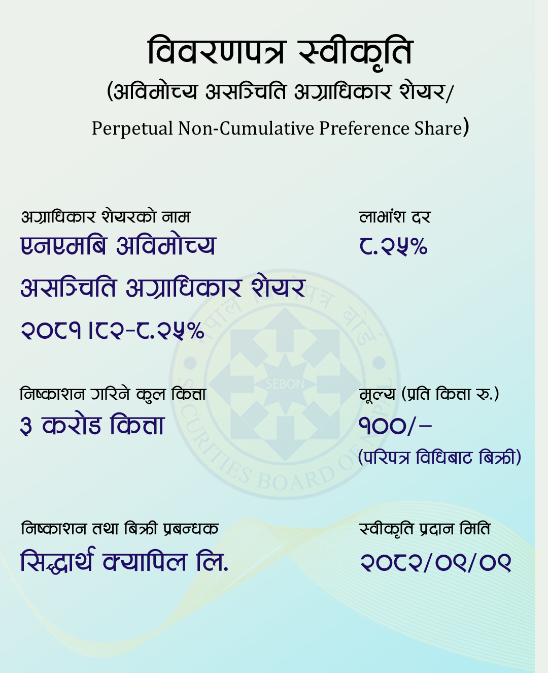 यसको लाभांश दर ८.२५ प्रतिशत छ भने ३ करोड कित्ता निष्काशन गरिनेछ । त्यस्तै, प्रतिकित्ता मूल्य १०० रुपैयाँ रहेको छ  भने परिपत्र विधिबाट बिक्री हुनेछ । यसका लागि सिद्धार्थ क्यापिटल लिमिटेडलाई निष्काशन तथा बिक्री प्रबन्धक राखिएको छ ।