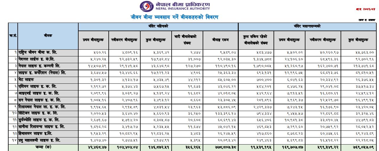 प्राधिकरणको तथ्यांक अनुसार पाँच महिनाको अवधिमा सबैभन्दा बढी बीमा शुल्क नेपाल लाइफ इन्स्योरेन्स, नेशनल लाइफ, एलआइसी नेपाल र हिमालयन लाइफ इन्स्योरेन्स लगायतका कम्पनीले बीमा शुल्क संकलन गरेको छ । नेपाल लाइफले २९ अर्ब ३७ करोड ४१ लाख, नेशनलले ९ अर्ब २७ करोड २ लाख, एलआइसीले ८ अर्ब १८ करोड १० लाख र हिमालयन लाइफ इन्स्योरेन्सले ६ अर्ब ९२ करोड ४३ लाख बराबर बीमा शुल्क संकलन गरेको छ ।