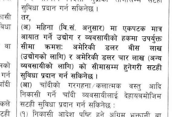 काठमाडौं । एकपटक मात्र चाँदी आयात गर्नेहरुको हकमा अब विशेष सुविधाको व्यवस्था गरिएको छ । उद्योगहरुले वर्षमा एकपटक मात्रै चाँदी आयात गरेमा अमेरिकी डलर २० लाख डलरसम्म र अन्य व्यवसायीहरुको लागि अमेरिकी डलर ४ लाखसम्मको सटही सुविधा प्रदान गरिने भएको छ ।