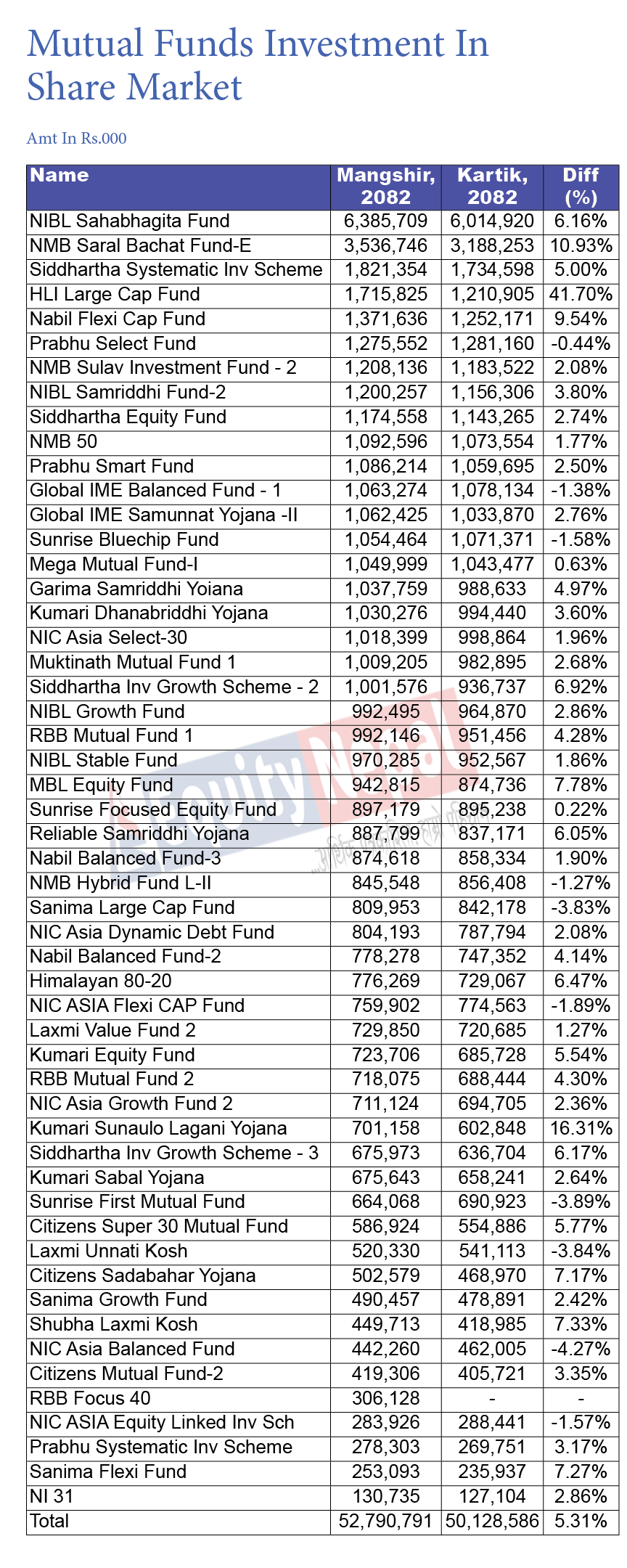 यता, ५३ मध्ये ८ वटा म्युचुअल फन्डहरुले मात्र नाफा कमाएका छन् । बाँकी सबै घाटामा छन् । रिपोर्ट अनुसार मंसिर महिनामा फन्डहरुको सेयर बजारमा ५२ अर्ब ७९ करोड ७ लाख रुपैयाँ लगानी रहेको देखिएको छ । यो अघिल्लो महिनाको भन्दा ५.३१ प्रतिशत धेरै हो । अघिल्लो महिना फन्डहरुको सेयर बजारमा ५० अर्ब १२ करोड लगानी थियो ।