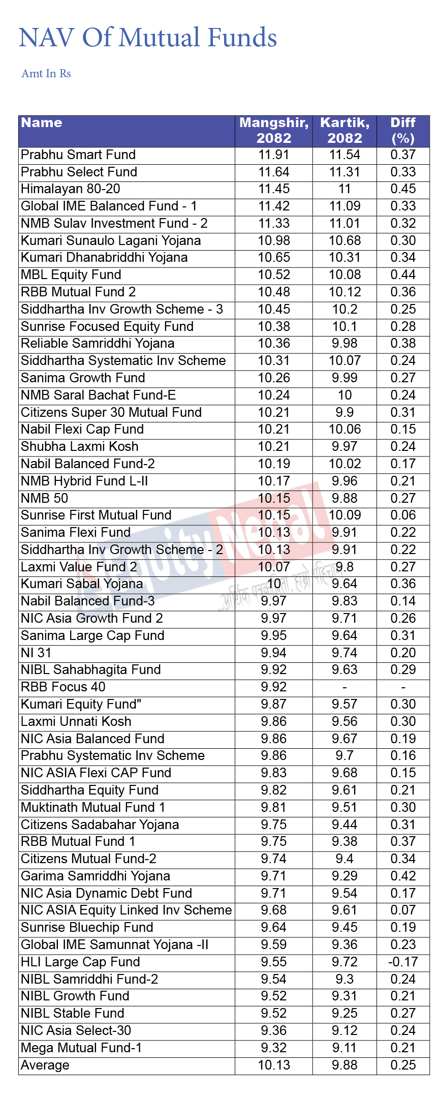 प्रभु स्मार्ट फन्डको न्याभ सबैभन्दा धेरै ११.९१ रुपैयाँ छ । त्यस्तै, प्रभु सेलेक्ट फन्डको न्याभ ११.६४ रुपैयाँ छ । ५३ मध्ये ५ वटाको न्याभ ११ रुपैयाँ भन्दा धेरै छ । यता, २७ वटाको उक्त भ्याल्यू १० रुपैयाँ भन्दा कम देखिएको छ ।