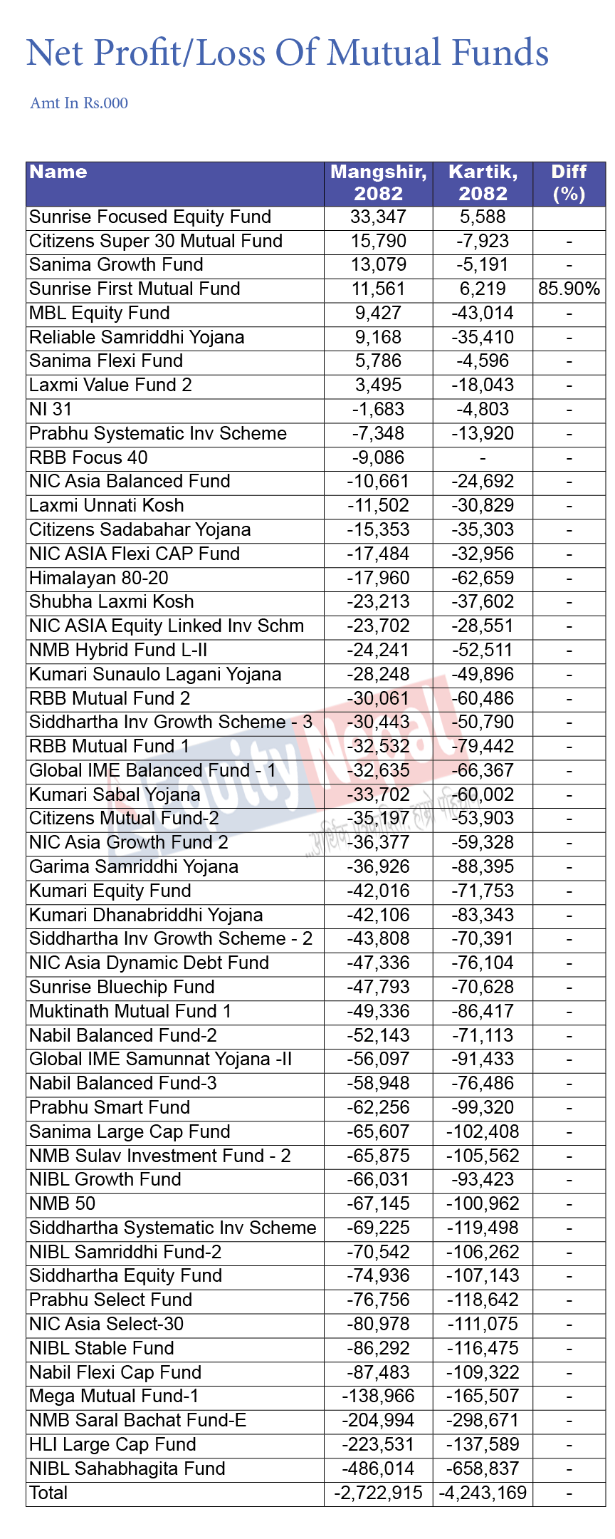 सञ्चालनमा रहेका म्युचुअल फन्डहरुले मंसिर महिनासम्म समग्रमा २ अर्ब ७२ करोड रुपैयाँ घाटा व्यहोरेका छन् । अघिल्लो महिना यिनीहरुले ४ अर्ब २४ करोड नोक्सानी व्यहोरेका थिए । ५३ वटा फन्डमध्ये ८ वटा मात्र नाफामा छन् ।
