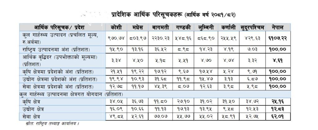 राष्ट्रिय तथ्याङ्क कार्यालयले सार्वजनिक गरेको प्रारम्भिक तथ्याङ्कका आधारमा प्रदेशहरूको समग्र आर्थिक अवस्था तुलना गर्दा आर्थिक वर्ष २०८१/ ८२ मा मुलुकको कुल गार्हस्थ्य उत्पादनमा बागमती प्रदेशको हिस्सा सबैभन्दा धेरै ३६.५ प्रतिशत, कोशी प्रदेशको हिस्सा १५.९ प्रतिशत रहेको छ भने कर्णाली प्रदेशको हिस्सा सबैभन्दा कम ४.२ प्रतिशत रहेको छ ।