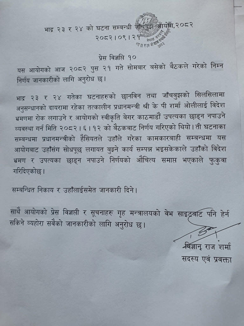 काठमाडौं । कपा (एमाले) का अध्यक्ष केपी शर्मा ओलीको स्थानहद फुकुवा भएको छ । भदौ २३ र २४ गतेको जेनजी आन्दोलनका बेला प्रधानमन्त्री रहेका ओलीलाई जाँचबुझ आयोगले स्थानहद लगाएको थियो । आयोगको सोमबार बसेको बैठकले ओलीको विदेश भ्रमणमा लगाइएको रोक र काठमाडौँ उपत्यका छाड्न नपाउने पूर्ववर्ती निर्णय फुकुवा गरेको हो।