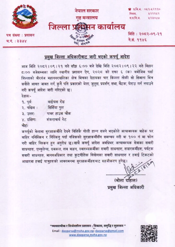 काठमाडौं । जिल्ला प्रशासन कार्यालय पर्साले वीरगञ्ज महानगर क्षेत्रमा साँझ ६ बजेदेखि भोलि बिहान ८ बजेसम्म कर्फ्यु आदेश जारी गरेको छ ।