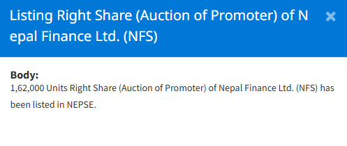 काठमाडौं । नेपाल स्टक एक्सचेन्ज (नेप्से) मा नेपाल फाइनान्सको १ लाख ६२ हजार कित्ता हकप्रद सेयर सूचीकृत भएको छ । यस फाइनान्सको लिलामिमा ल्याइएको संस्थापक समूहको सेयर सूचीकृत गरिएको नेप्सेले जनाएको छ । उक्त सेयर डिम्याट खातामा जम्मा भएपछि कारोबार गर्न सकिनेछ ।