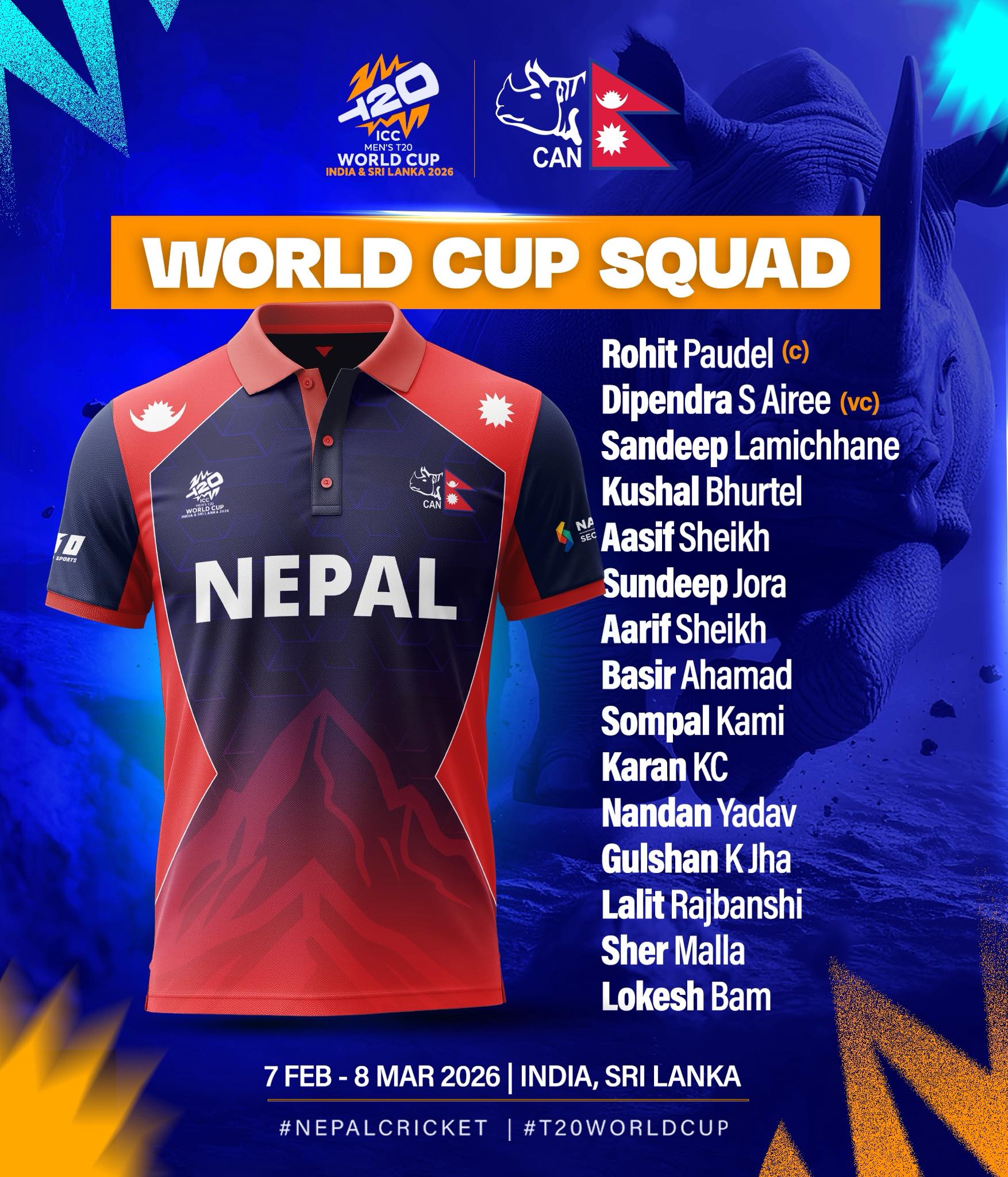 रोहित पौडेलको कप्तानीमा एनपिएल सिजन २ मा उत्कृष्ट प्रदर्शन गरेका शेर मल्ल पहिलो पटक समावेश भएका छन् । नयाँ खेलाडीमा बसिर अहमद विश्वकप टोलीमा पर्दा कुशल मल्ल र आदिल आलम टिमबाट छुटेका छन् ।