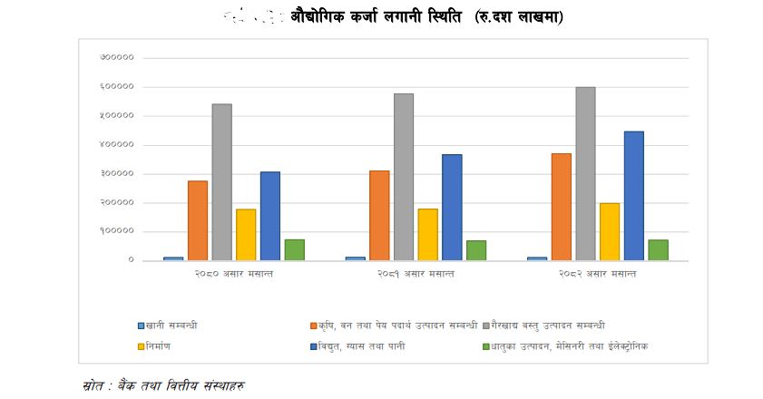 कुल कर्जामध्ये औद्योगिक क्षेत्रमा प्रवाहित कर्जाको अंश ३०.४२ प्रतिशत रहेको छ । औद्योगिक कर्जामध्ये सबैभन्दा बढी गैर–खाद्य वस्तु उत्पादनसम्बन्धी उद्योगमा ३५.२७ प्रतिशत, विद्युत ग्याँस तथा पानीसम्बन्धी उद्योगमा २६.२६ प्रतिशत, कृषि, वन तथा पेय पदार्थसम्बन्धी उद्योगमा २१.८५ प्रतिशत, निर्माणसम्बन्धी उद्योगमा ११.७० प्रतिशत, धातुका उत्पादन, मेसिनरी तथा ईलेक्ट्रोनिक सम्बन्धी उद्योगमा ४. २३ प्रतिशत र सबैभन्दा कम खानीसम्बन्धी उद्योगमा ०.६९ प्रतिशत कर्जा प्रवाह भएको छ ।