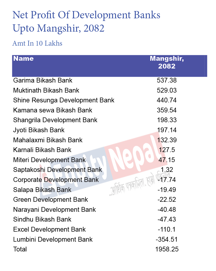 तथ्यांक अनुसार १७ वटा विकास बैंकहरुले समग्रमा १ अर्ब ९५ करोड नाफा आर्जन गरेका छन् । जसमध्ये, गरिमा विकास बैंकले ५३ करोड ७३ लाख नाफा कमाएको छ । त्यस्तै, मुक्तिनाथले ५२ करोड ९० लाख, शाइन रेसुंगाले ४४ करोड, कामना सेवाले ३५ करोड ९५ लाख, सांग्रिला डेभलपमेन्टले १९ करोड ८३ लाख, ज्योति विकासले १९ करोड ७१ लाख र महालक्ष्मीले १३ करोड २३ लाख नाफा कमाएको छ ।