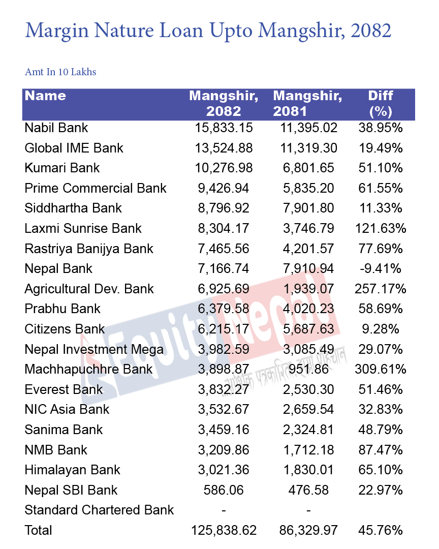 यता, माछापुच्छ्रे बैंकको सेयर कर्जा ३०९.८८ प्रतिशत र कृषि विकास बैंकको २५७.१४ प्रतिशतले बढेको छ । माछापुच्छ्रे बैंक चालु आवमा ३ अर्ब ८९ करोड ८० लाख कर्जा प्रवाह गरेको छ । गत वर्षको सोही अवधिमा बैंकले ९५ करोड १० लाख कर्जा प्रवहा गरेको थियो।
