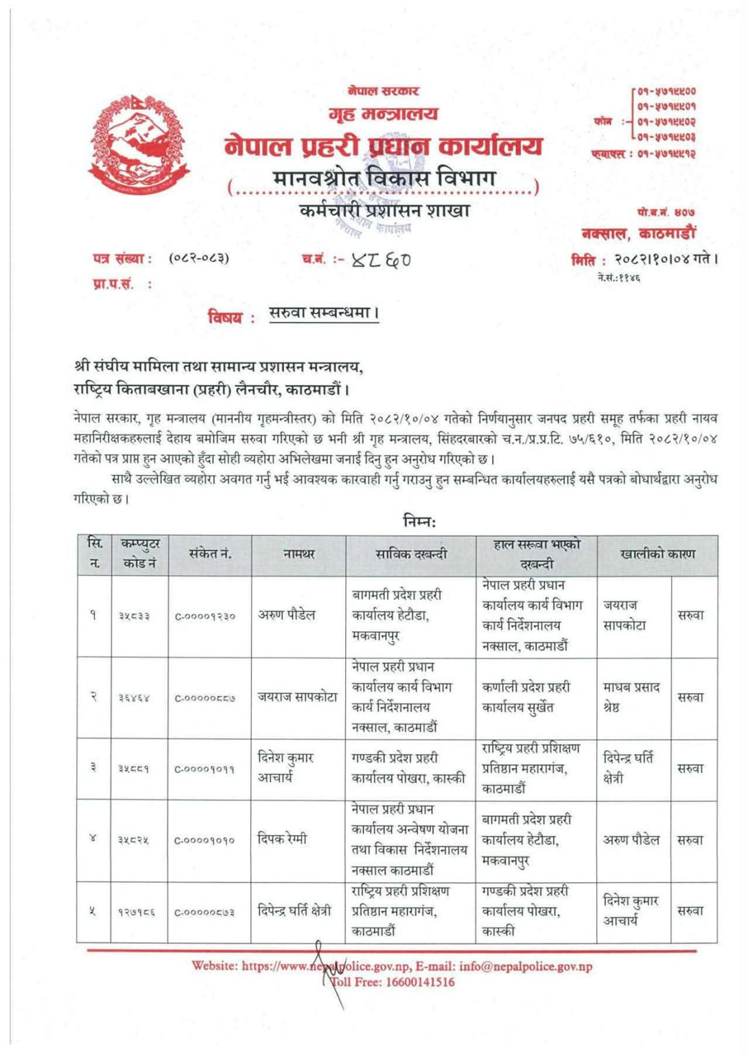 यसैगरी दिपेन्द्र घर्ती क्षेत्री, भुपेन्द्रबहादुर खत्री, माधव प्रसाद श्रेष्ठ र राजेन्द्र प्रसाद भट्टको पनि सरुवा भएको छ । पौडेललाई प्रहरी प्रधान कार्यालयको कार्यविभाग कार्य निर्देशनालयमा, सापकोटालाई कर्णाली प्रदेशमा, आचार्यलाई प्रहरी प्रशिक्षण प्रतिष्ठान महाराजगञ्जमा र रेग्मीलाई अन्वेषण योजना तथा विकास निर्देशनालयमा सरुवा गरिएको छ ।