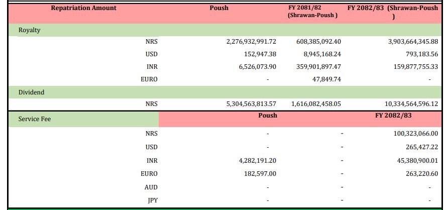 उनीहरूले लगानी प्रस्ताव उद्योग विभागमार्फत गर्छन् भने लगानी भित्र्याउने तथा लाभांश लैजाने काम भने राष्ट्र बैंकमार्फत गर्छन् । विदेशी लगानीको हकमा लाभांश लैजान, लेखांकन गर्न भने राष्ट्र बैंकमार्फत गर्नुपर्ने हुन्छ त्यसैले गर्दा आर्थिक वर्षको अन्त्यमा कायम रहेको विनियम दर (खरिद र बिक्री दरको औसत)लाई लिई उक्त रकम मूल्यांकन गरिएको राष्ट्र बैंकले जनाएको छ । विभागका अनुसार १५ वटाभन्दा बढी मुलुकका लगानीकर्ताहरूले उक्त लाभांश रकम लगेका हुन् ।