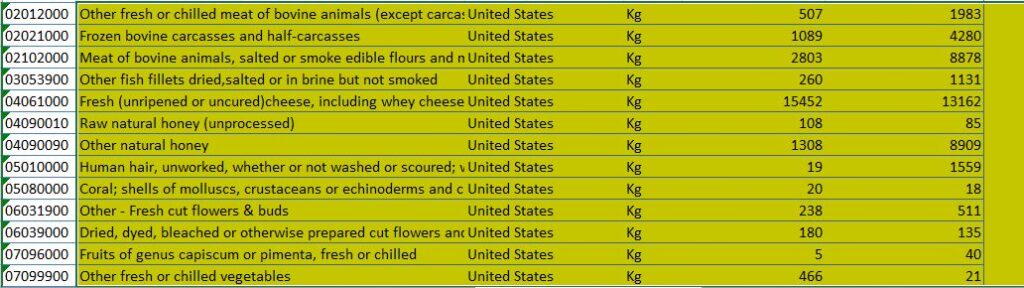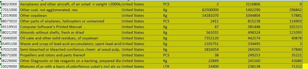 छ महिनाको अवधिमा अमेरिकाबाट ३ अर्ब ११ करोड ६८ लाखको हवाइजहाजका सामग्री तथा पाटपुर्जा, १ अर्ब ४० करोड २२ लाखको कोइला, एक अर्ब ४ करोड ४८ लाखको भटमासको आयात गरेको छ । यसका साथै तेल, बदाम, कम्पयुटर, आर्मीका हातहतियार लगायतका सामग्री आयात गरेको छ ।