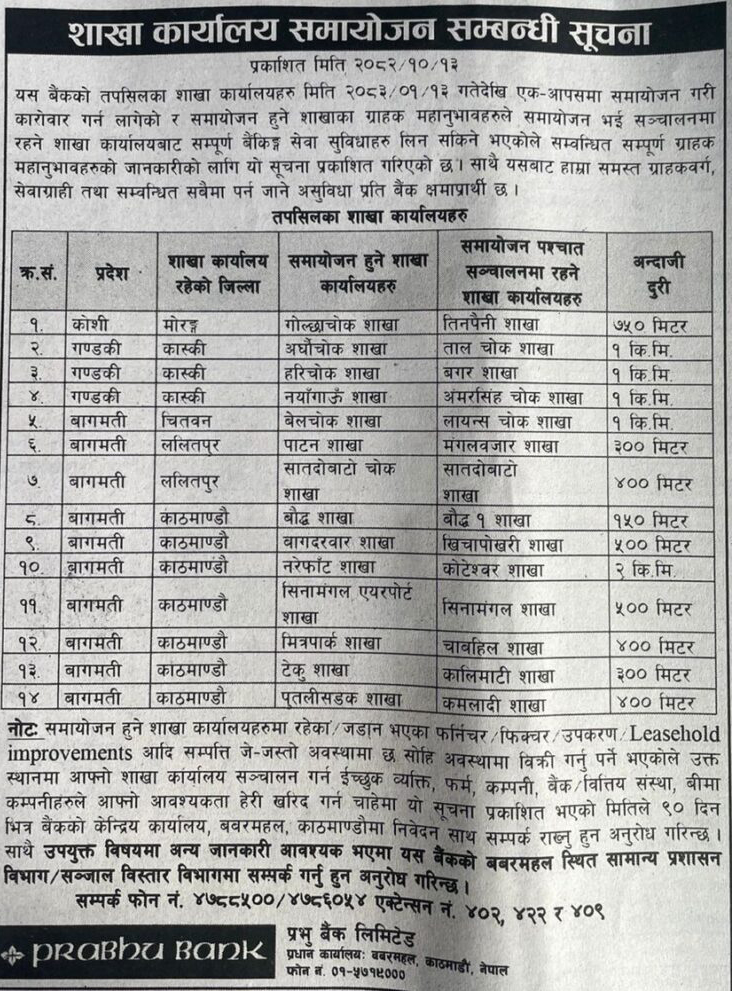 प्रभु बैंकका १४ शाखा कार्यालय समायोजना