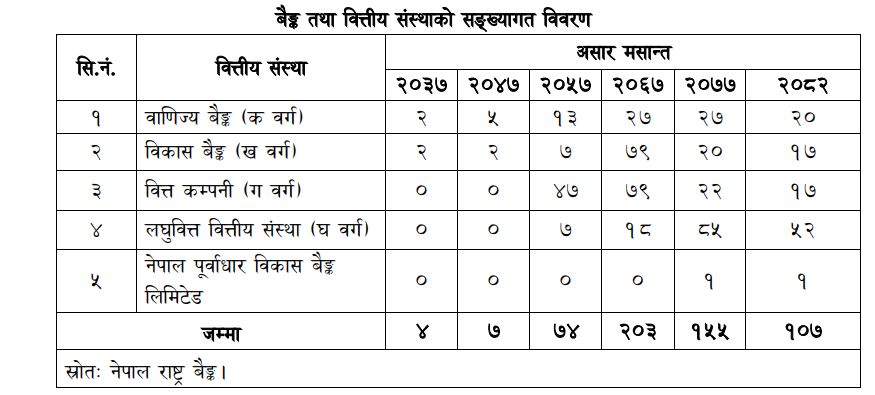 राष्ट्र बैंकका अनुसार २०४७ मा ५ वटा वाणिज्य बैंक र २ वटा विकास बैंक सञ्चालनमा रहेका थिए । २०७७ मा २७ वटा वाणिज्य बैंक र २० वटा विकास बैंक, २२ वटा वित्त कम्पनी र ८५ वटा लघुवित्त सञ्चालनमा थिए । २०८२ मा आइपुग्दा उक्त संख्या अर्थात् २० वटा वाणिज्य बैंक र १७ वटा विकास बैंक, १७ वटा वित्त कम्पनी र ५२ वटा लघुवित्त सञ्चालनमा छ । सरकारले पछिल्लो समय बैंक तथा वित्तीय संस्थालाई एक आपसमा गाभिने निर्देशन दिए सँगै वाणिज्य बैंक, विकास बैंक , वित्त कम्पनी र लघुवित्तको संख्या घटेको हो ।