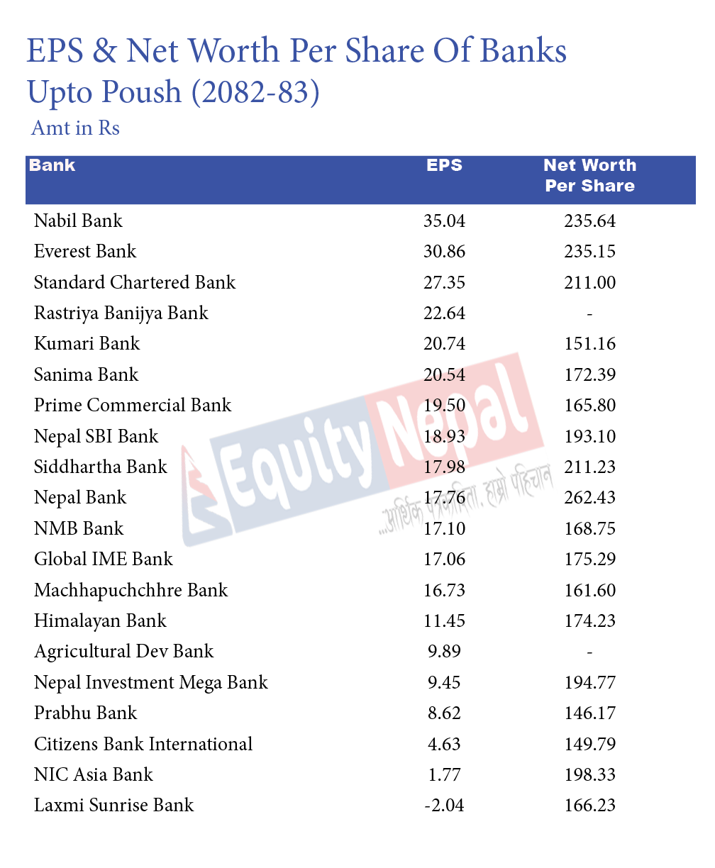 नबिल बैकको प्रतिसेयर आम्दानी ३५.०४ रुपैयाँ छ । यसको प्रतिसेयर नेटवर्थ भने २३५.६४ रुपैयाँ छ । एभरेष्टको इपीएस ३०.८६ रुपैयाँ छ भने नेटवर्थ २३५.१५ रुपैयाँ छ । १४ वटा बैंको प्रतिसेयर आम्दानी १० रुपैयाँ भन्दा धेरै छ ।