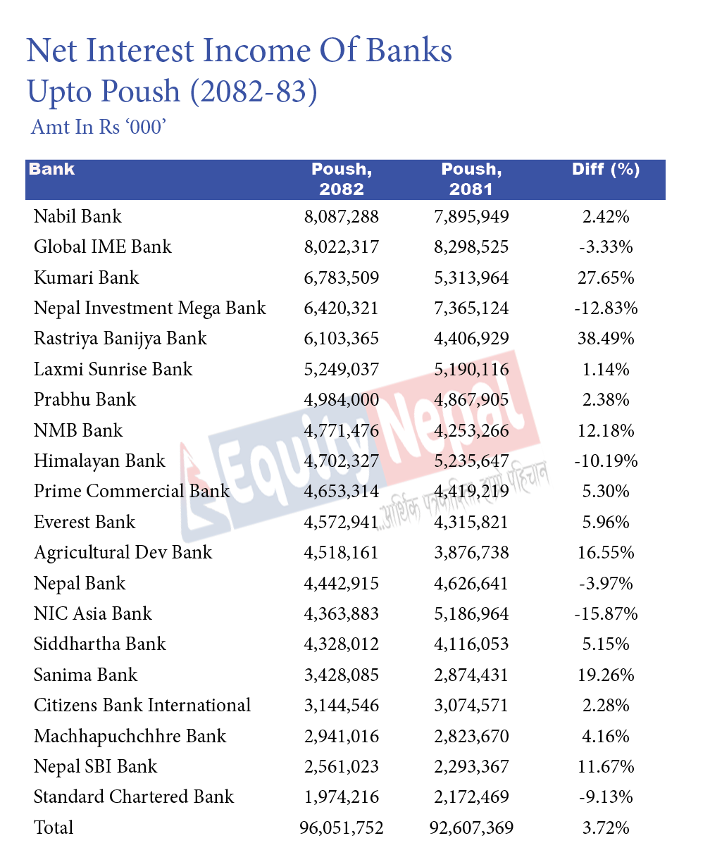सबैभन्दा धेरै खुद ब्याज आम्दानी गर्नेमा नबिल बैंक अगाडि छ । यसले ६ महिनामा ८ अर्ब ८ करोड रुपैयाँ ब्याज आम्दानी गरेको छ । यो गत वर्षको सोही अवधिको तुलनामा २.४२ प्रतिशत धेरै हो । त्यस्तै, ग्लोबल आइएमईले ८ अर्ब २ करोड ब्याज आम्दानी गरेको छ । समग्रमा बैंकहरुले ९६ अर्ब ६ करोड रुपैयाँ खुद ब्याज आम्दानी गरेका छन् ।
