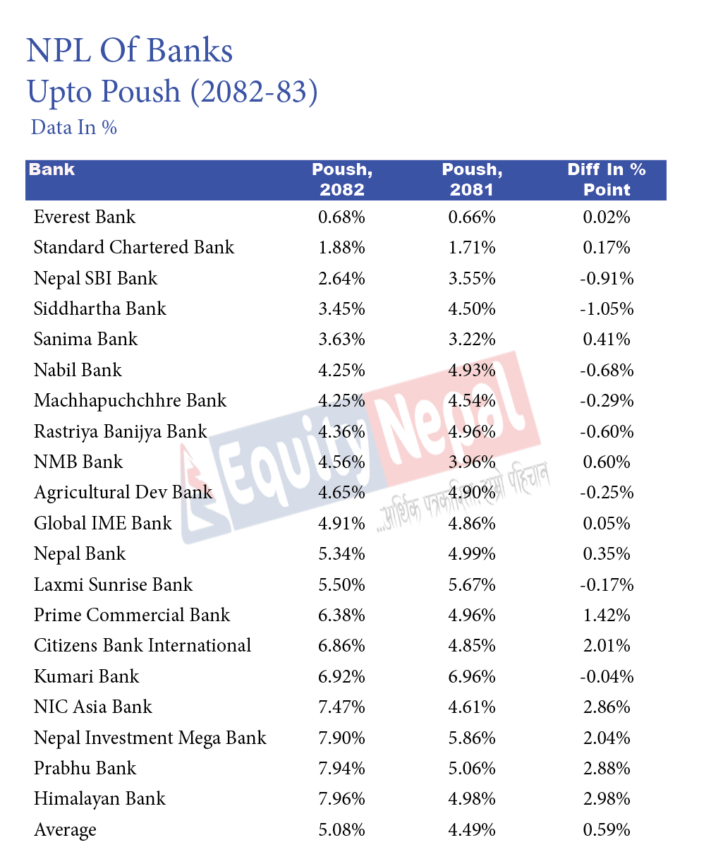 सबै भन्दा कम एनपीएल एभरेष्ट बैंकको छ । यसको एनपीएल ०.६८ प्रतिशत छ भने स्टान्डर्ड चार्टर्डको १.८८ प्रतिशत छ । एनआइसी एसिया, नेपाल इन्भेष्टमेन्ट मेगाको, प्रभु र हिमालयन बैंकको एनपीएल ७ प्रतिशत भन्दा धेरै छ ।