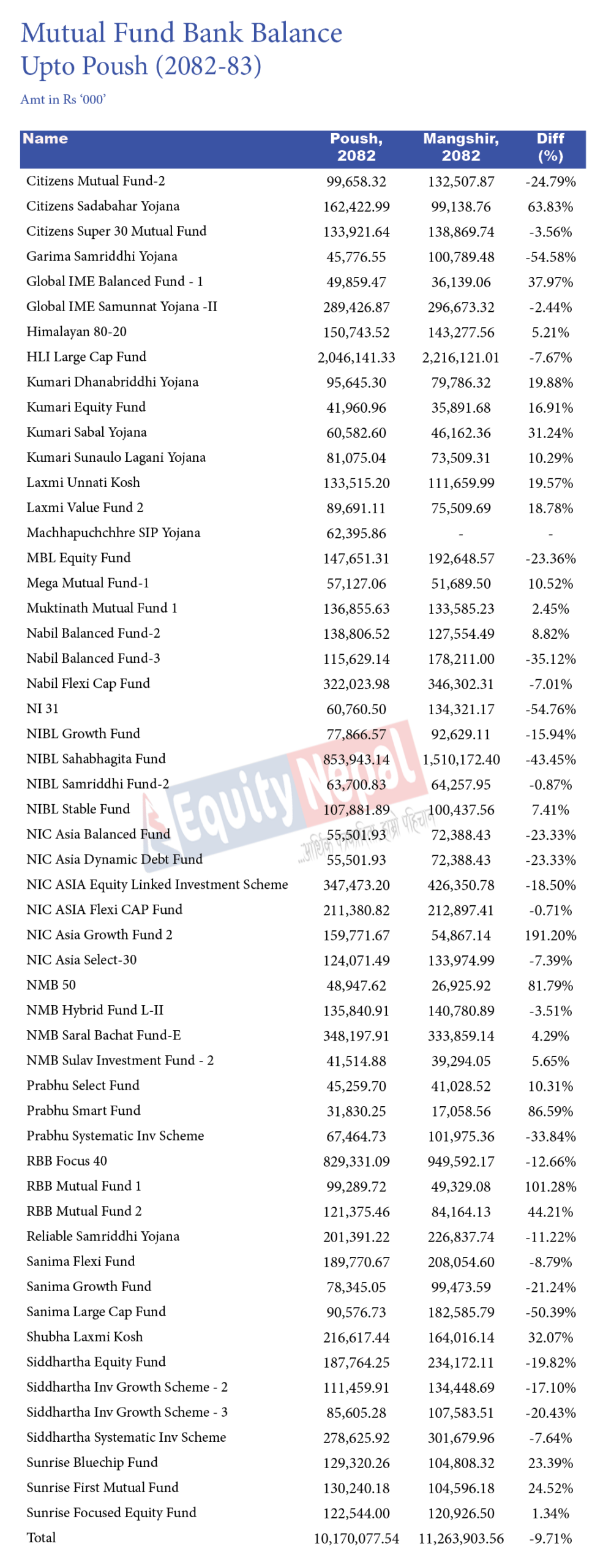 जसमध्ये, एचएलआई लार्ज क्याप फन्डको बैंक मौज्दातमा सबैभन्दा धेरै २ अर्ब ४ करोड रुपैयाँ जम्मा रहेको छ । यो अघिल्लो महिनाको भन्दा ७.६७ प्रतिशत कम हो । अघिल्लो महिना यस फन्डले बैंकमा २ अर्ब २१ करोड जम्मा गरेको छ । त्यस्तै, एनआइबिएल सहभागिता फन्डको बैंक मौज्दातमा ८५ करोड ३९ लाख, आरबीबी फोकस ४० मा ८२ करोड ९३ लाख, एनएमबि सरल बचत फन्ड-इको ३४ करोड ८१ लाख रुपैयाँ बचत छ ।