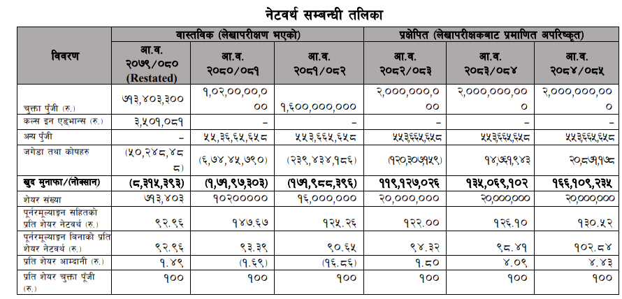 गत आर्थिक वर्षमा कम्पनीले १७ करोड १९ लाख रुपैयाँ घाटा व्यहोरेको छ । कम्पनीले आर्थिक वर्ष २०८२-८३ को अन्त्यसम्ममा ११ करोड ९१ लाख रुपैयाँ नाफा कमाउने प्रक्षेपण गरेको छ । त्यस्तै, २०८३—८४ मा १३ करोड ५० लाख रुपैयाँ नाफा कमाउने प्रक्षेपण गरेको छ । चालु आर्थिक वर्षमा कम्पनीको प्रतिसेयर नेटवर्थ ९४.३२ रुपैयाँ कायम हुने प्रक्षेपन छ । गत वर्ष यसको नेटवर्थ ९०.६५ रुपैयाँ छ ।