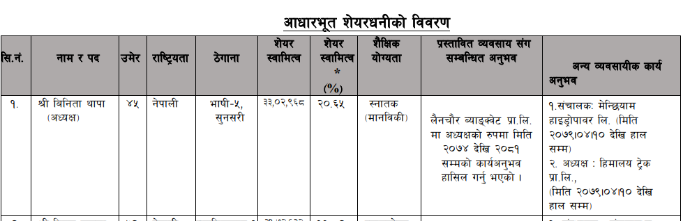 आइपीओ निष्कासनपछि संस्थापक सेयरधनीको हिस्सा ८० प्रतिशत र सर्वसाधारण समूहको हिस्सा २० प्रतिशत रहनेछ । कम्पनीको अध्यक्ष बिनिता थापा छिन् ।