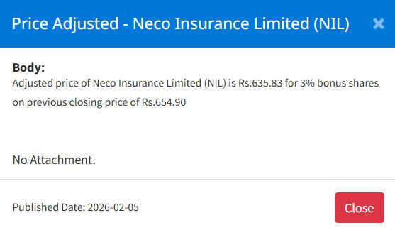 काठमाडौं । नेपाल स्टक एक्सेचन्ज (नेप्से) मा नेको इन्स्योरेन्सको बोनस सेयरमा मूल्य समायोजन भएको छ । नेको इन्स्योरेन्सको ३ प्रतिशत बोनस सेयरमा मूल्य समायोजन हुँदा भाउ ६३५.८३ रुपैयाँ कायम भएको छ । बिहीबारको अन्तिम कारोबार मूल्य ६५४.९० रुपैयाँलाई आधार मानेर भाउ समायोजन गरेको हो । कम्पनीको समायोजित मूल्यलाई आधार मानेर आइतबार कारोबार खुला हुनेछ।