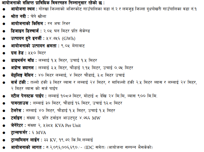यस कम्पनीले गोरखा जिल्लाको अजिरकोट गाउँपालिका वडा नं.२ र लमजुङ जिल्ला दुधपोखरी गाउँपालिका वडा नं.१ स्थित जलविद्युत आयोजनाबाट ९.०५ मेगावाट जलविद्युत उत्पादन गर्ने उद्देश्य अनुरुप जलविद्युत आयोजनाको निर्माण, उत्पादन तथा संचालन गर्न नेपाल सरकार उर्जा, जलस्रोत तथा सिंचाई मन्त्रालयबाट २०७८ जेठ ७ गतेबाट विद्युत उत्पादनको अनुमति प्राप्त गरेको हो ।