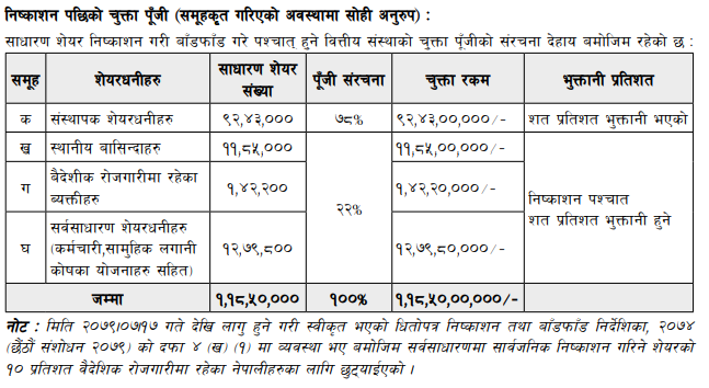 आइपीओ निष्कासनपछि संस्थापक सेयरधनीको हिस्सा ७८ प्रतिशत र सर्वसाधारण समूहको हिस्सा २२ प्रतिशत रहनेछ ।