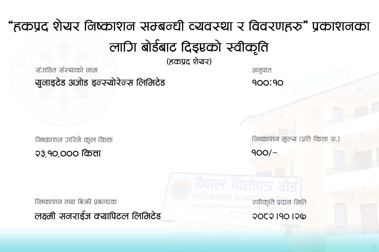 काठमाडौं । नेपाल धितोपत्र बोर्डले युनाइटेड अजोड इन्स्योरेन्सलाई हकप्रद निष्कासनको अनुमति दिएको छ । बोर्डले कम्पनीलाई माघ २७ गते हकप्रद निष्कासनको अनुमति प्रदान गरेको हो ।
