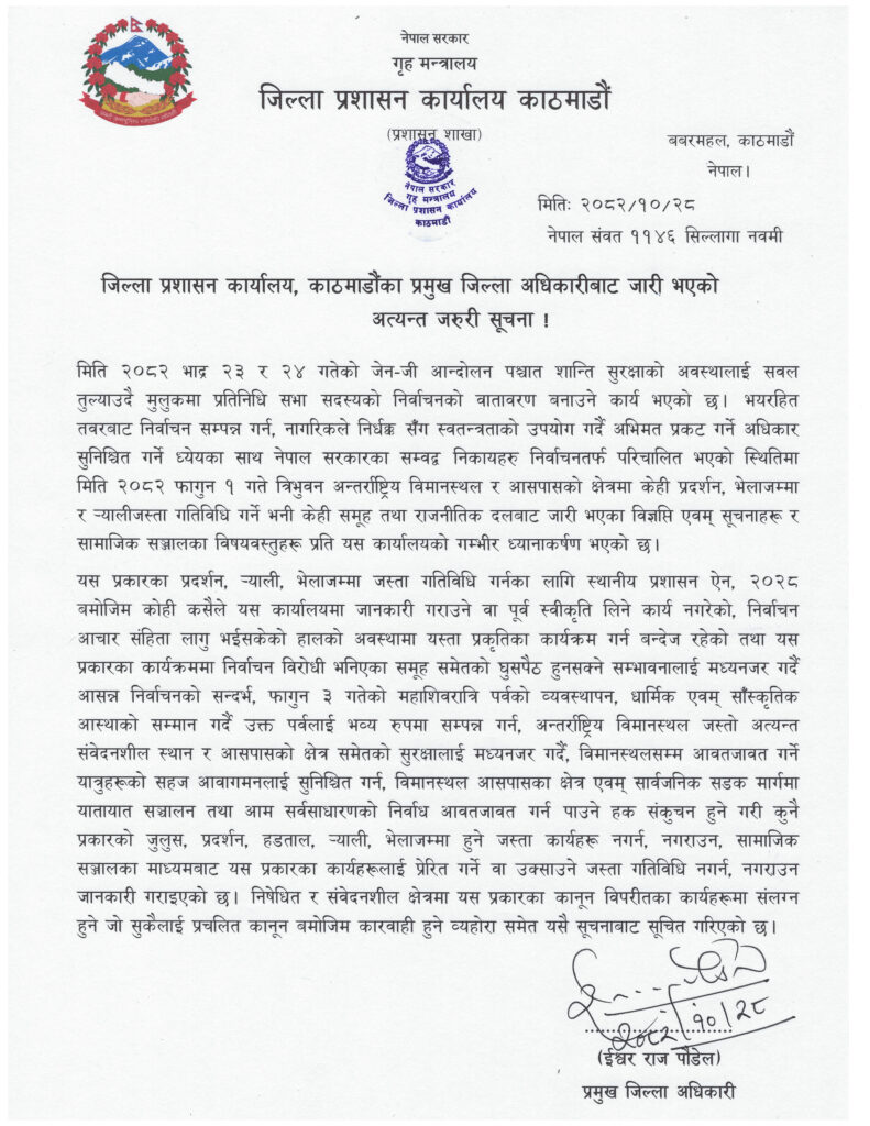 यद्यपि, निषेध आदेश जारी गरिएका क्षेत्र बाहेकका स्थानमा संविधान प्रदत्त विचार तथा अभिव्यक्तिको स्वतन्त्रता र शान्तिपूर्ण भेला हुने अधिकारप्रति प्रशासन प्रतिबद्ध रहेको स्पष्ट पारिएको छ। विमानस्थल क्षेत्रलाई उच्च सुरक्षा संवेदनशील क्षेत्र मानिँदै आएको छ। पछिल्ला दिनमा प्रदर्शनको घोषणा भएपछि यात्रु आवागमन, अन्तर्राष्ट्रिय उडान तथा सुरक्षामा असर नपरोस् भन्ने उद्देश्यले निषेधाज्ञा जारी गरिएको प्रशासनले जनाएको छ।
