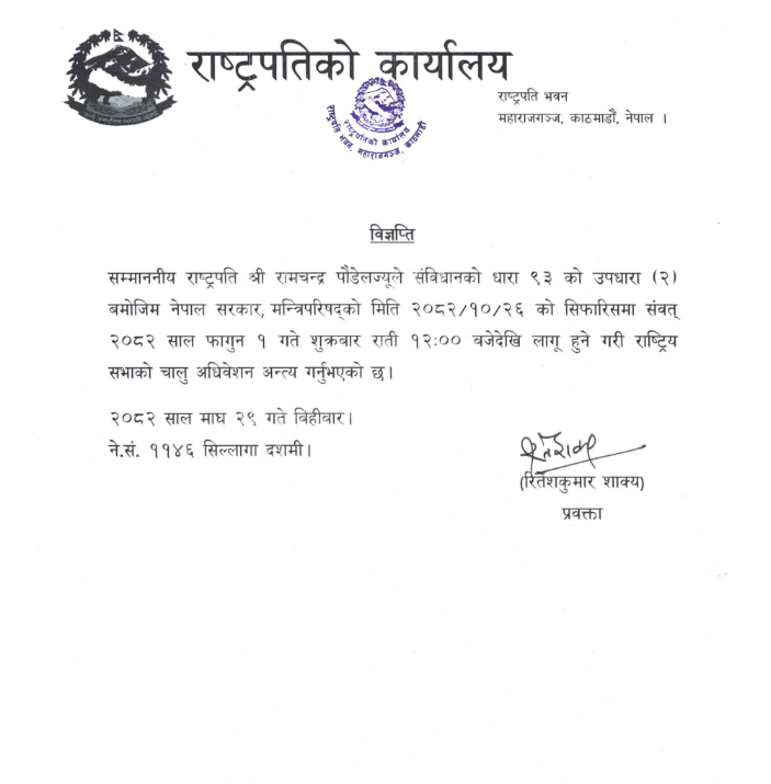काठमाडौं । भोलिदेखि लागू हुने गरी राष्ट्रियसभा अधिवेशन अन्त्य गरिएको छ । राष्ट्रपति रामचन्द्र पौडेलले नेपालको संविधानको धारा ९३ को उपधारा ९२० बमोजिम अधिवेशन अन्त्य गर्ने निर्णय गरेका हुन् । नेपाल सरकार, मन्त्रिपरिषद्को २०८२ माघ २६ गतेको सिफारिसमा २०८२ फागुन १ गते शुक्रबार राति १२ः०० बजेदेखि लागू हुने गरी राष्ट्रिय सभाको अधिवेशन अन्त्य गरिएको हो ।