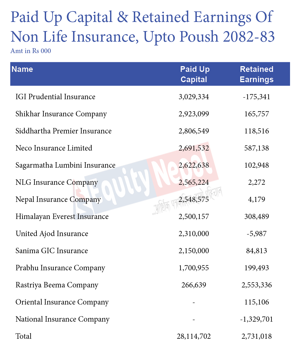निर्जीवन बिमामध्ये सबैभन्दा धेरै चुक्ता पुँजी आइजीआई प्रुडेन्सियलको देखिएको छ । यसको पुँजी ३ अर्ब २ करोड ९३ लाख रहेको छ ।शिखरको २ अर्ब ९२ करोड, सिद्धार्थ प्रिमियरको २ अर्ब ८० करोड र नेको इन्स्योरेन्सको २ अर्ब ६९ करोड रुपैयाँ पुँजी छ । यता, राष्ट्रिय बिमा कम्पनीको रिटेन्ड अर्निङमा सबैभन्दा धेरै २ अर्ब ५५ करोड रुपैयाँ छ । ३ वटाको सञ्चित ऋणात्मक छ ।