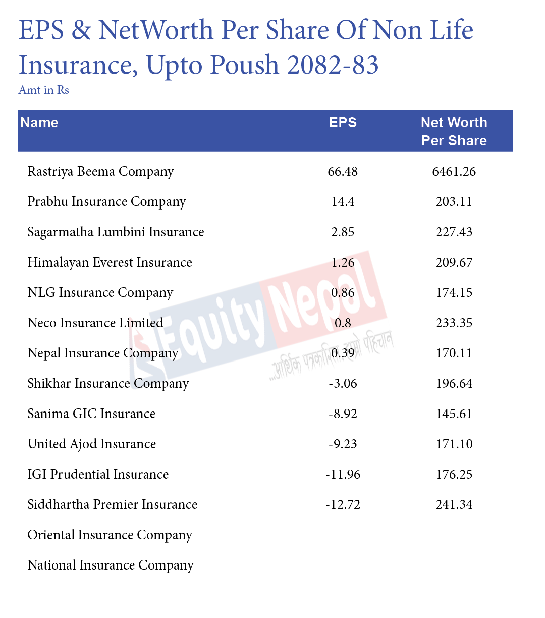 राष्ट्रिय बिमा कम्पनीको प्रतिसेयर आम्दानी ६६.४८ रुपैयाँ छ । प्रभुको १४.४ रुपैयाँ इपीएस छ । त्यस्तै, नटवेर्थ पनि राष्ट्रिय बिमाकै सबैभन्दा धेरै छ ।