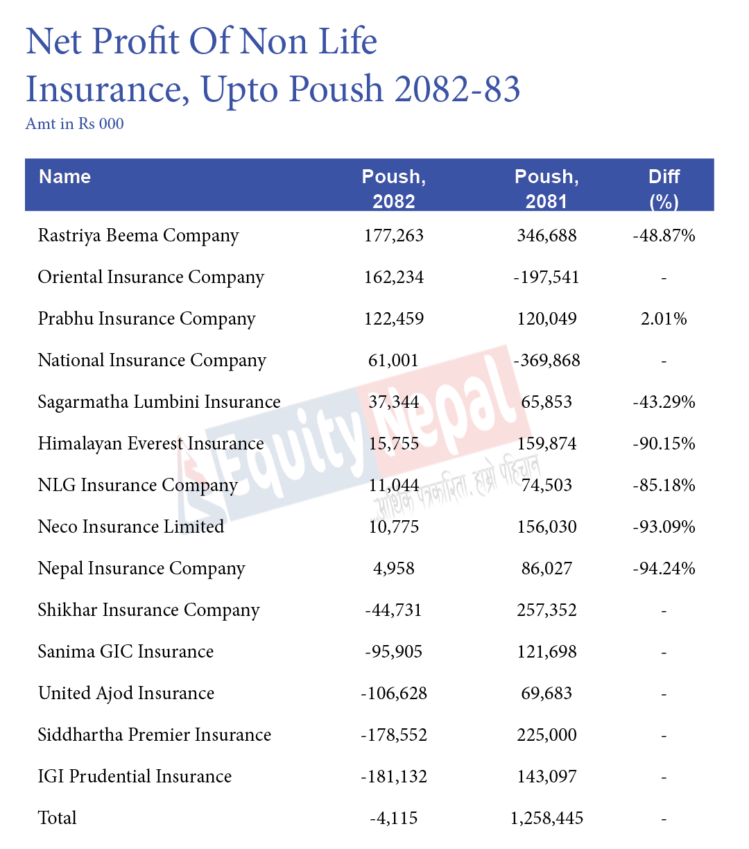 १४ कम्पनीहरुमध्ये ५ वटाले चालु आवको ६ महिनामा खुद घाटा व्यहोरेका छन् । यसअवधिसम्म  ९ वटाले मात्र नाफा आर्जन गरेका छन् । सबैभन्दा धेरै नाफा आर्जन गर्नेमा राष्ट्रिय बिमा कम्पनी रहेको छ । यसले ६ महिनामा १७ करोड ७२ लाख रुपैयाँ नाफा कमाएको छ ।