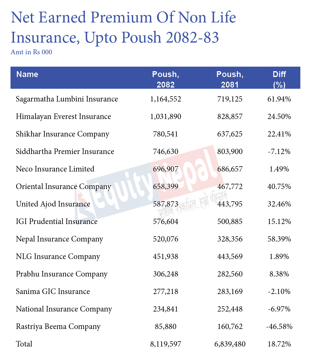 बिमा कम्पनीहरुले ६ महिनामा ८ अर्ब ११ करोड रुपैयाँ बिमा शुल्क संकल गरेका छन् । यो गत वर्ष भन्दा १८.७२ प्रतिशत धेरै हो । गत वर्षको पुसमा कम्पनीहरुले ६ अर्ब ८३ करोड बिमा शुल्क संकलन गरेका थिए । पुससम्म सगरमाथा लुम्बिनीले १ अर्ब १६ करोड, एभरेष्ट इन्स्योरेन्सले १ अर्ब ३ करोड बिमा शुल्क संकलन गरेका छन् ।