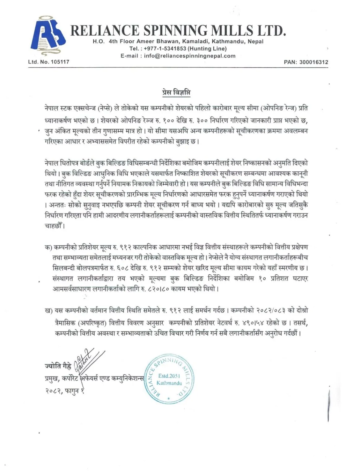 काठमाडौं । रिलायन्स स्पिनिङ मिल्स लिमिटेडले नेपाल स्टक एक्सचेन्ज (नेप्से) ले कम्पनीको सेयर कारोबारका लागि निर्धारण गरेको प्रारम्भिक कारोबार मूल्य सीमा (ओपनिङ रेन्ज) प्रति असन्तुष्टि जनाएको छ।
