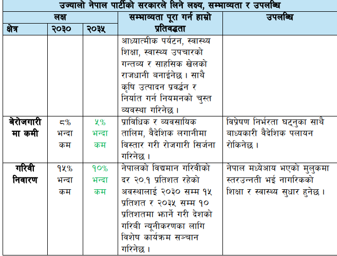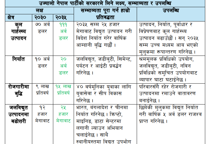 आर्थिक क्षेत्रमा पार्टीले २०३० सम्म गार्हस्थ्य उत्पादन वृद्धि, रोजगारी सिर्जना र निर्यात वृद्धि गर्ने लक्ष्य प्रस्तुत गरेको छ। ऊर्जा, कृषि, पर्यटन, शिक्षा, स्वास्थ्य र पूर्वाधार क्षेत्रमा पनि विस्तृत योजना सार्वजनिक गरिएको छ।